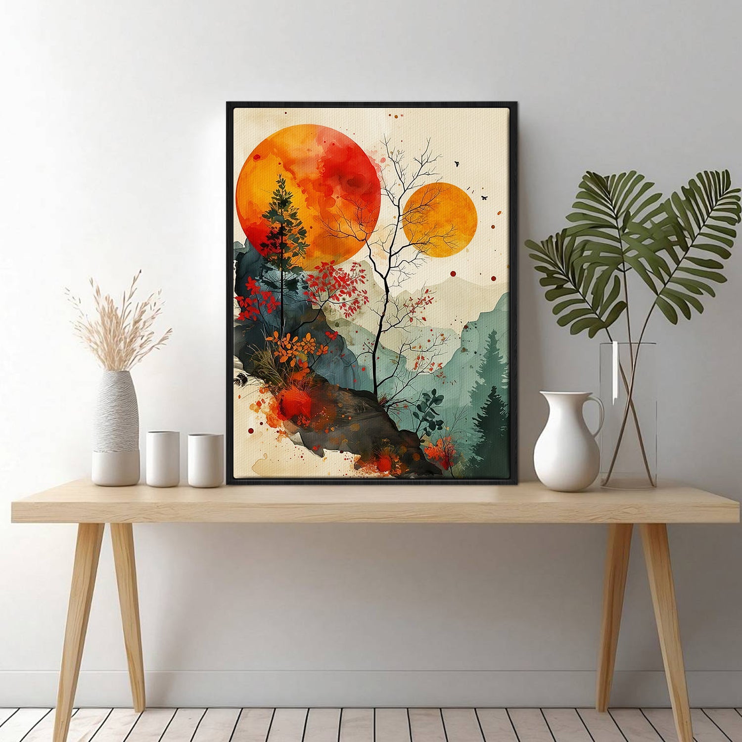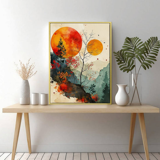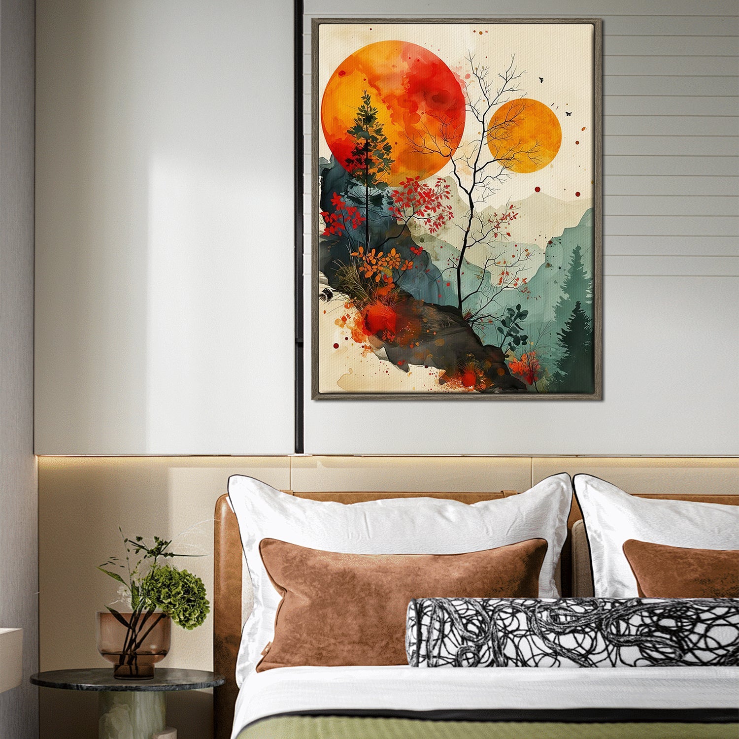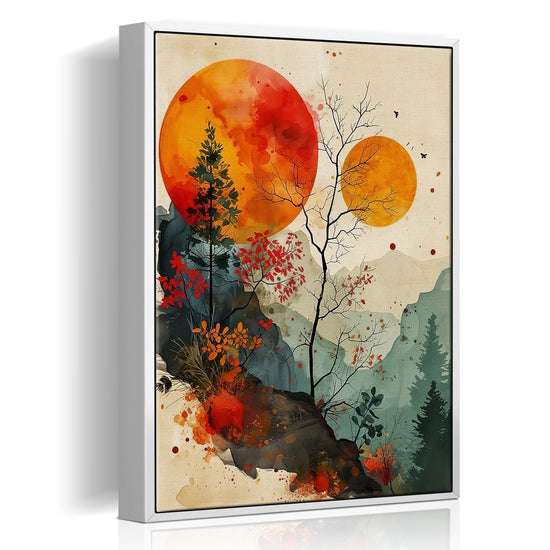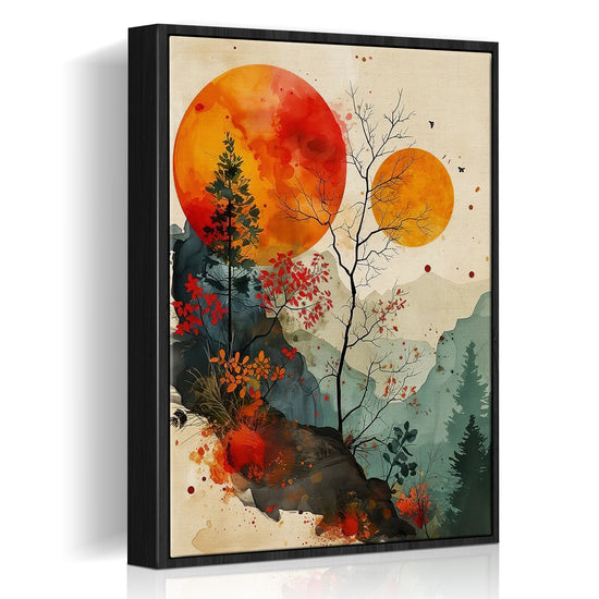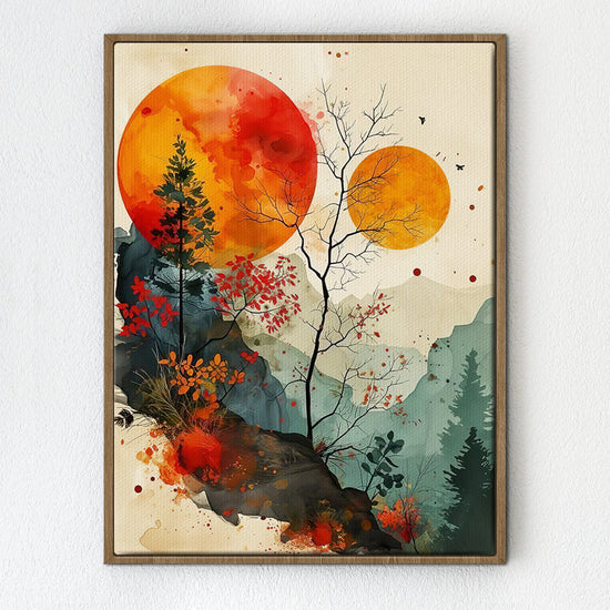 This wall art painting depicts an abstract autumn landscape, with the sun and moon both high in the sky, and crimson flowers and withered trees complementing the mountains. Its simple, rich colors, and bold style make it a striking piece of art, perfect for your home.