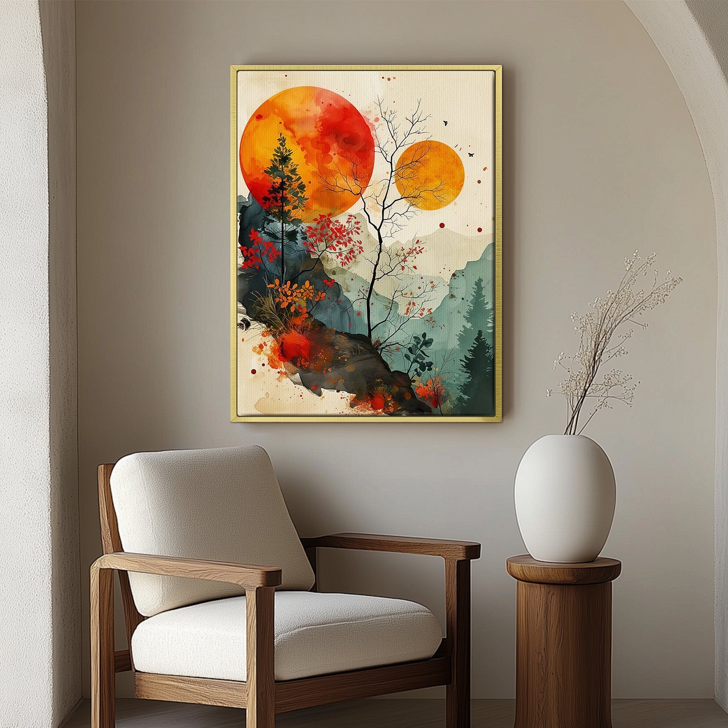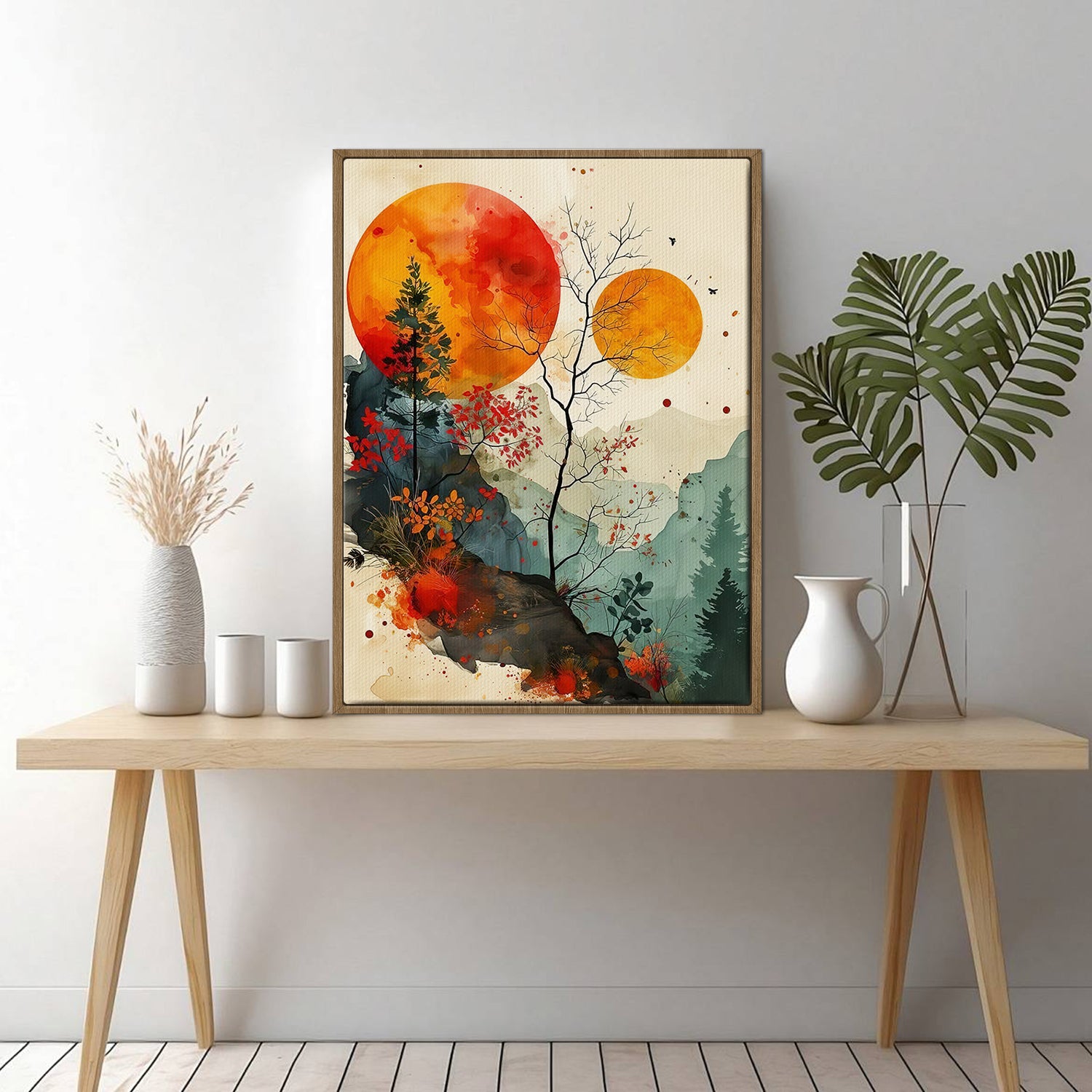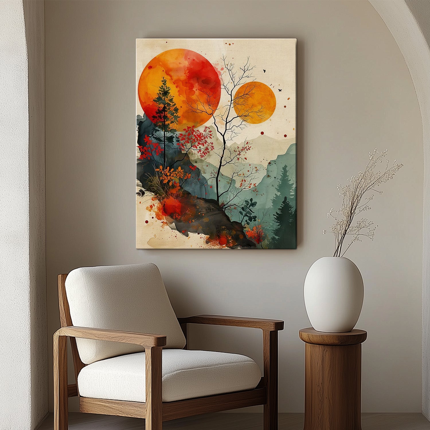 This wall art painting depicts an abstract autumn landscape, with the sun and moon both high in the sky, and crimson flowers and withered trees complementing the mountains. Its simple, rich colors, and bold style make it a striking piece of art, perfect for your home.