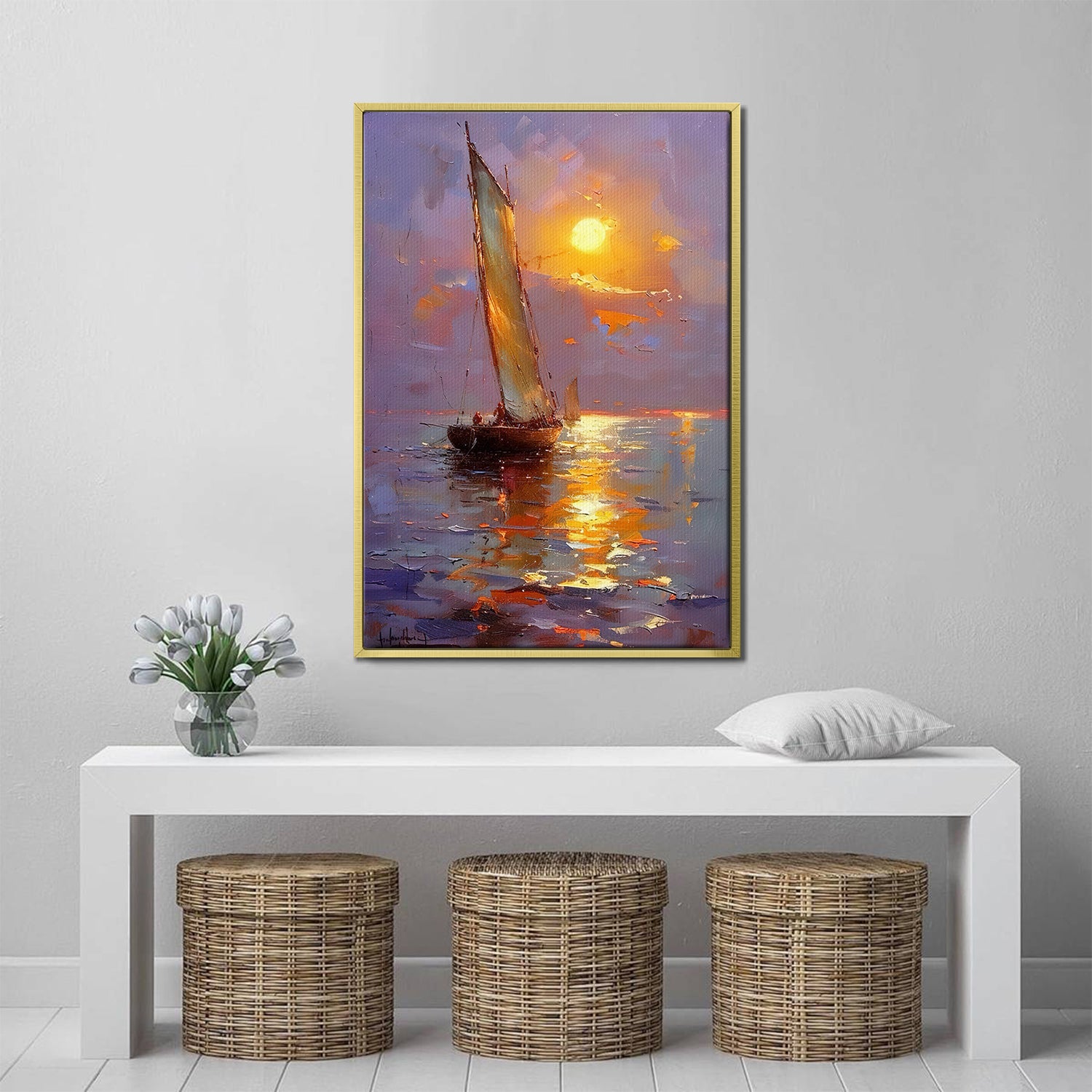 This wall art canvas depicts a sailboat sailing on the sea, which looks like it is coated with a layer of golden light under the sunlight. The painting looks very soft and beautiful.This artwork is perfect for your home decor.